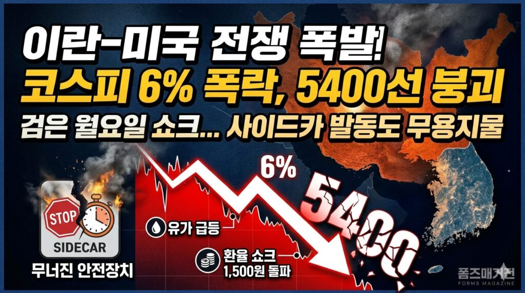 미국과 이란 간의 전면전 가능성이 고조되면서 국내 증시는 개장 직후부터 패닉 셀링(Panic Selling) 양상을 보였습니다. 코스피는 전 거래일 대비 6% 이상 폭락하며 심리적 지지선이었던 5400선을 허무하게 내주었습니다.